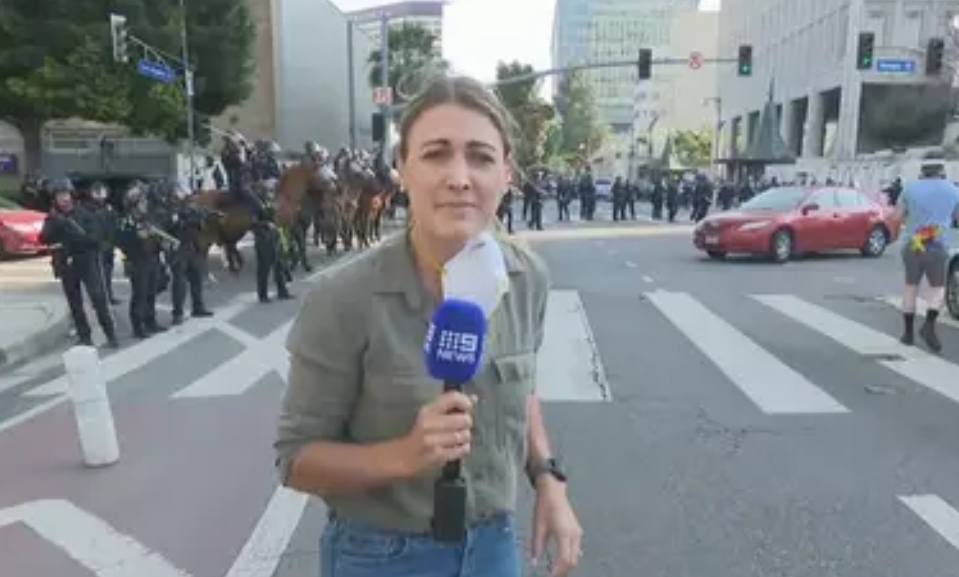 Lauren Tomasi was at the heart of the unrest, delivering a live report for Nine News when the situation took a dangerous turn. “After hours of standing off, this situation has now rapidly deteriorated,” she told viewers. “The LAPD is moving in on horseback, firing rubber bullets at protesters, moving them through the heart of LA.” Moments later, a rubber bullet struck her, prompting a bystander to exclaim, “You just f**king shot the reporter!” Despite the shock, Tomasi remained composed, reassuring her team, “I’m good,” when asked if she was okay.