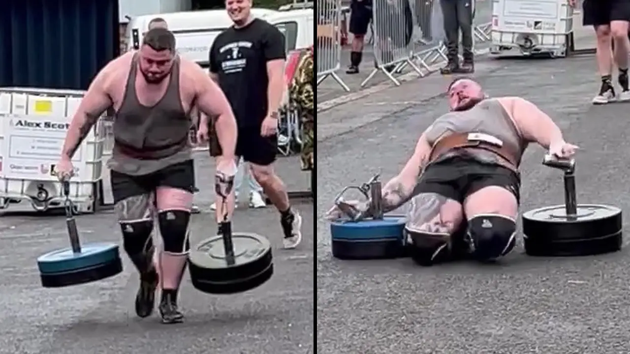 In a heart-stopping moment captured on video, Strongman Dan Jones suffered a catastrophic injury, snapping both patellar tendons, causing his kneecaps to slide into his thighs.